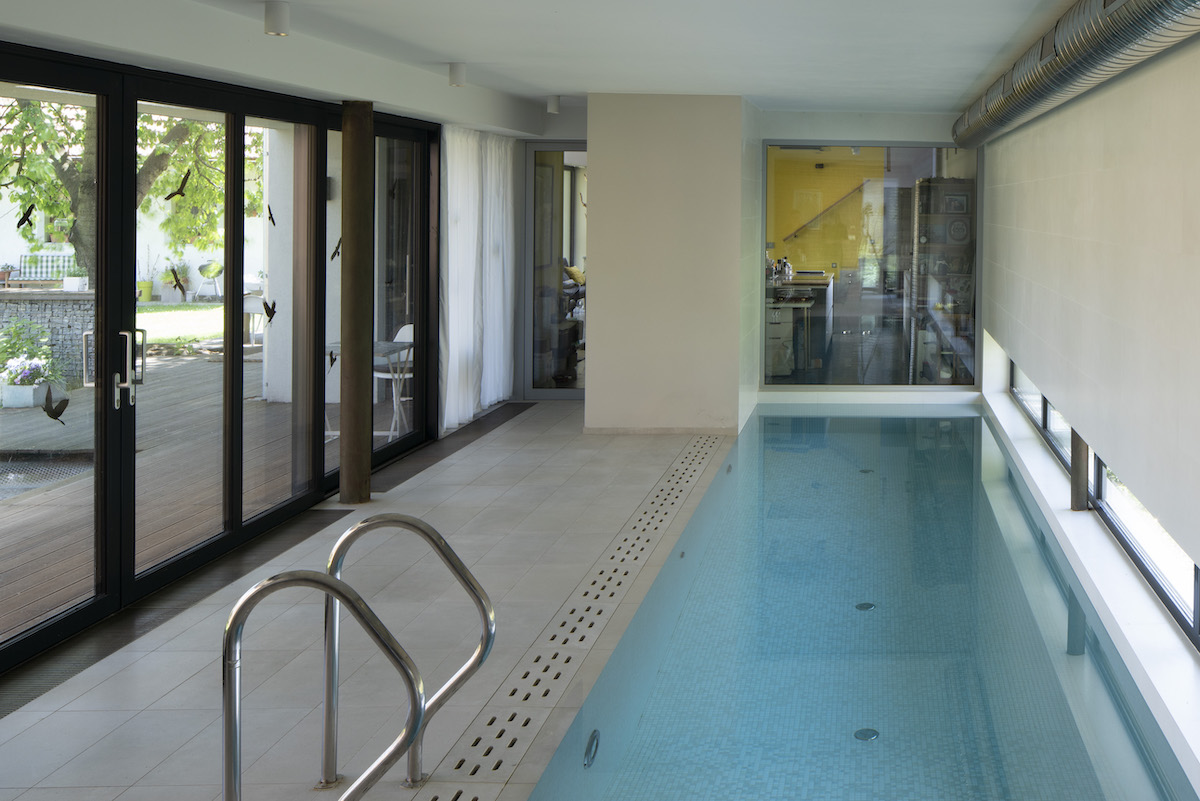 „Pracovný“ domček, kde je ateliér a garáž, spája s obytným priestorom obdĺžniková hmota s krytým bazénom.